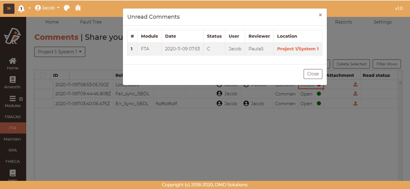 By clicking on UnreadComments, the list of new comments assigned to the user appears.