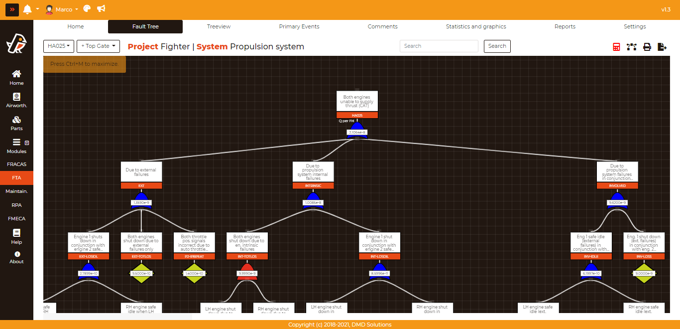 After clicking the “Create Fault Tree” button and choosing an FTA system to place the fault trees in, you can choose what top gates to include in them and provide the ratio from OH-FH ratio. This all results in a fault tree like the one below.