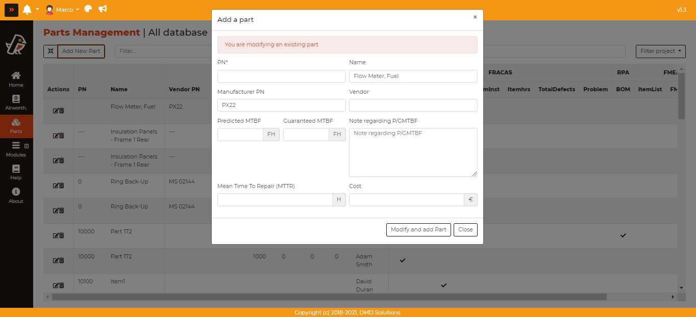 Add New Part: You can add new parts to use in the modules or match a PN in order to modify an existing part.