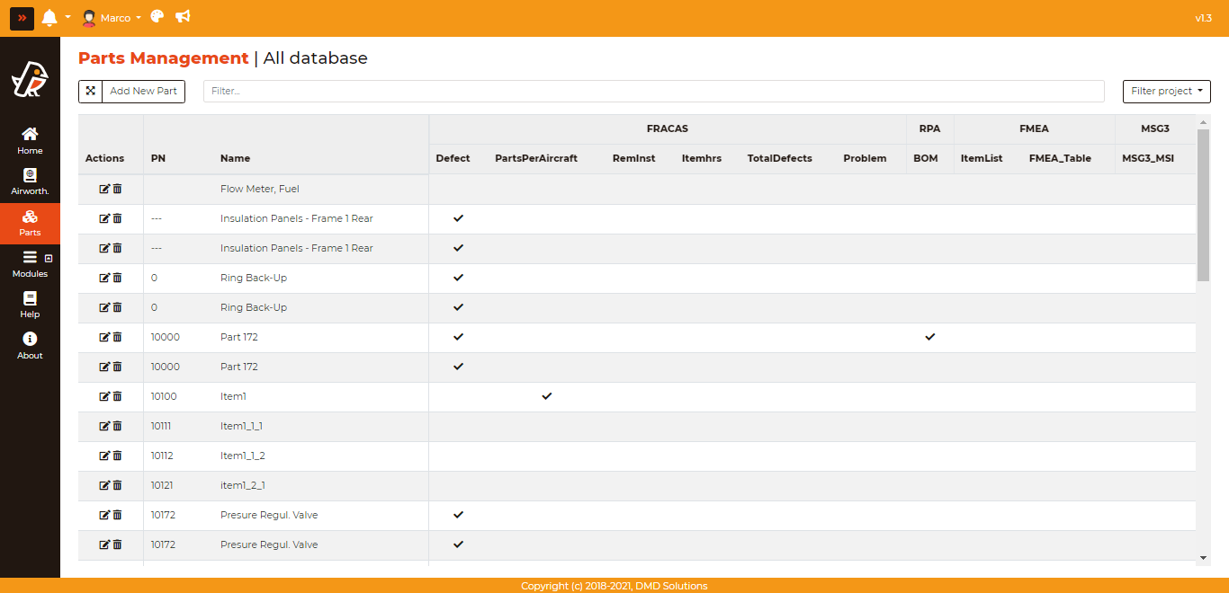 The Parts Management tab is a place where you can view the parts used in every single module, showing the part’s PN, Name, and where (table) in each module the part is being used (expressed with check marks).