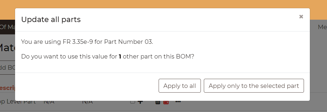• Copy calculation: This option is only available for last level items, i.e. parts without any children. By clicking in the copy icon, the user will get the option to copy the calculation or the entire part.