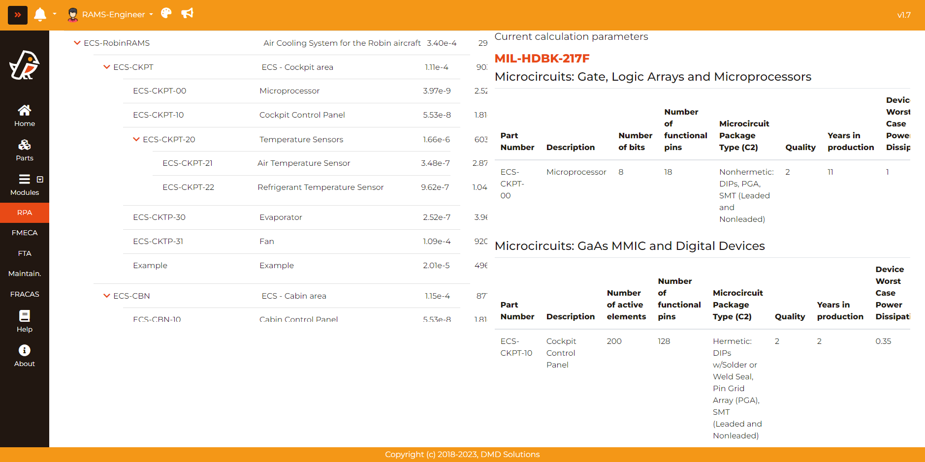 • See calculation parameters: After clicking this button, the tool will show all the parameters used to compute the reliability of the parts.