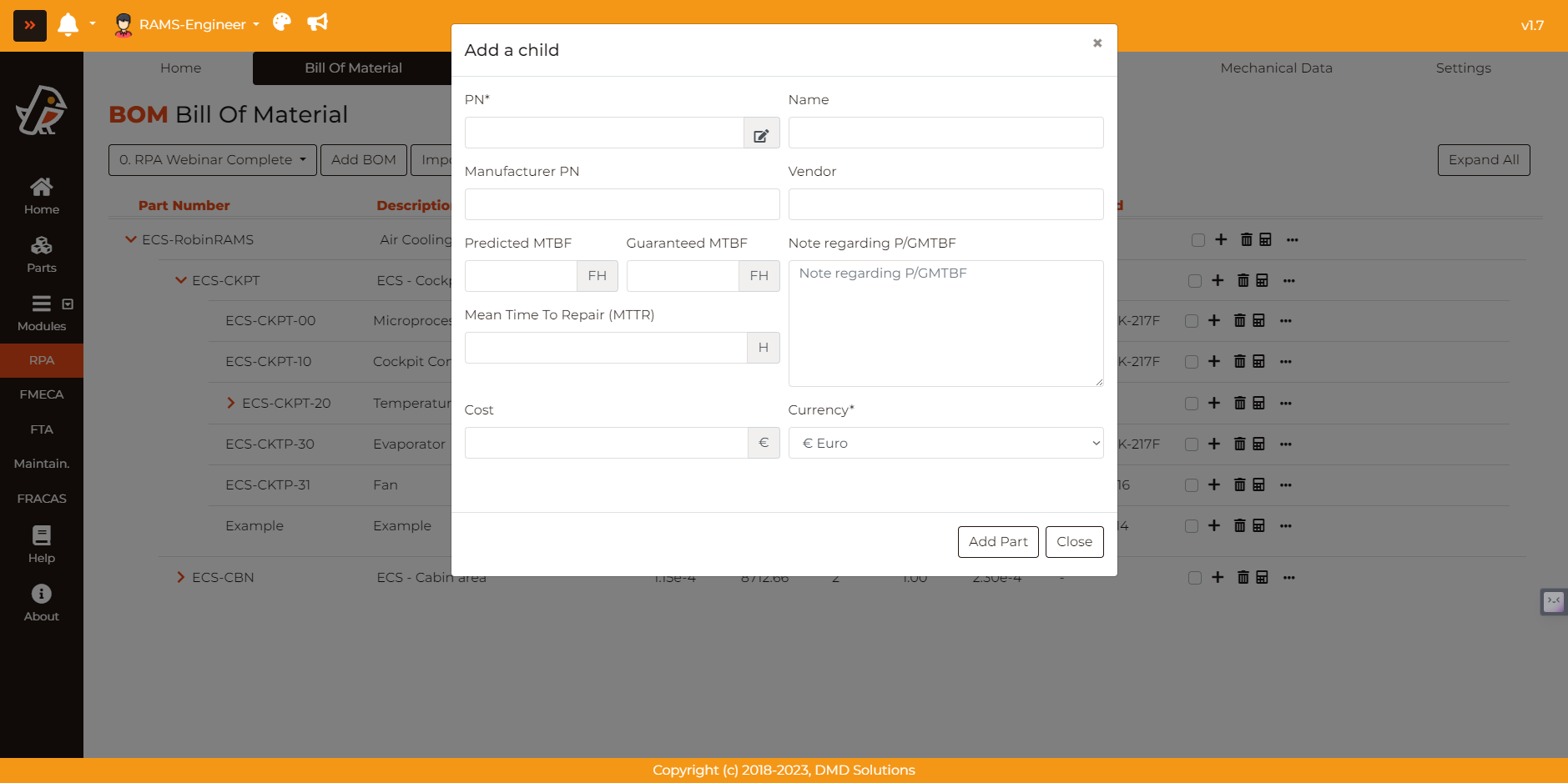 • Add a child: Action to add an item below a node of the BOM. The fields that are necessary to fill are the same as in FRACAS.