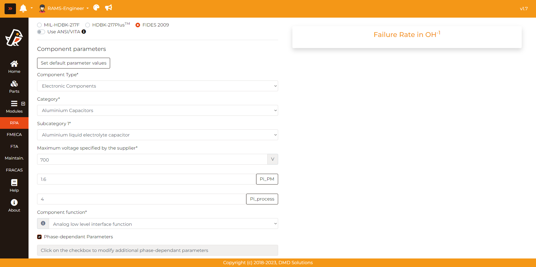 The FIDES 2009 model has specific features which make it being treated differently from other standards, as seen in the RPA > BOM. Two of its main characteristics are the prediction of the failure rate in calendar FIT and the use of special parameters (\(\pi_{PM}\) and \(\pi_{Process}\)) which are item dependent. A brief description of the FIDES special features is provided hereafter: